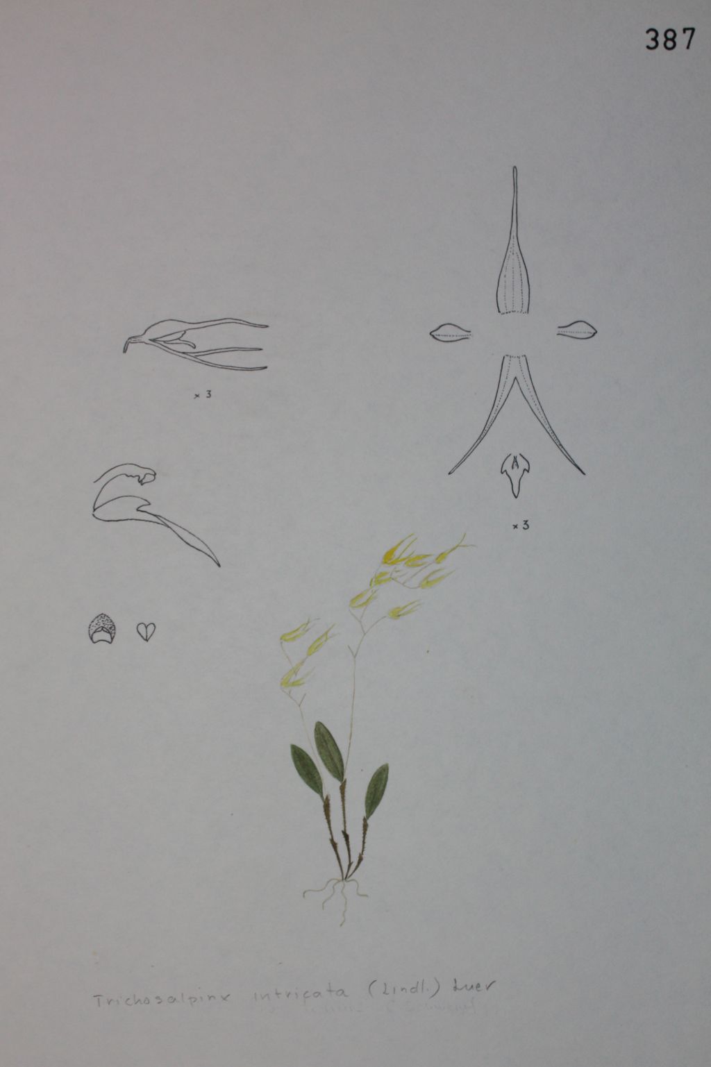 References W3 Tropicos, Kew Monocot list , IPNI ; Venezuelan Orchids Illustrated Vol 2 Dunsterville & Garay 1961 as Pleurothallis intricata drawing fide; AOS Bulletin Vol 33 #8 1964 asPleurothallis intricata; Flora de Venezuela Volumen XV Parte 2 Foldats 1970 as Pleurothallis intricata drawing good; Orchids of Venezuela, An Illustrated Field Guide Vol 3 Dunsterville & Garay 1979 as Pleurothallis intricata drawing fide; Miniature Orchids Northen 1980 as Pleurothallis intricata; Icones Pleurothallidinarum Vol XV Systematics of Trichosalpinx Luer 1997 drawing fide; Orchids of Venezuela [An illustrated field guide] Vol. 3 Ramiro and Carnevali 2000 drawing fide; Orquideas Nativas del Tachira Cesar Fernandez 2003 photo ok; Native Ecuadorian Orchids Vol 5 Dodson 2004 photo ok; Orchid Species Of Peru Zelenko & Bermudez 2009 photo