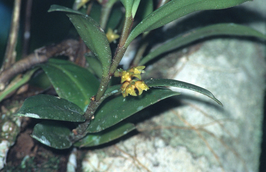 Found in Sabah & Sarawak Borneo in lower montane forests at elevations of 1100 to 2100 meters as a small to large sized, cool to cold growing epiphyte with erect stems carrying, distichous, very thick, rigid, leathery, narrowly elliptic, unequally bilobed leaves that blooms on an erect, through the leaf bases opposite the leaves, short, rather dense, several flowered inflorescence.