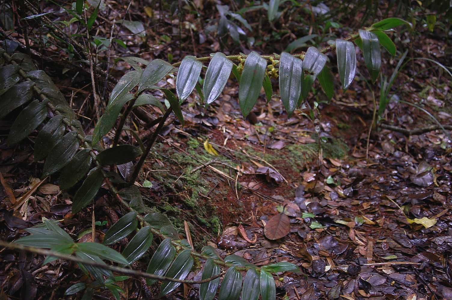 Found in peninsular Malaysia, Borneo, Sumatra and Java in exposed places in humid mountains at elevations of 820 to 1900 meters as a giant sized, warm to cool growing epiphyte or terrestrial with pendulous, terete, leafy throughout stems carrying oblong-lanceolate, acuminate leaves covered with light brown hairs and blooms on limply pendulous, 4" [10 cm] long, pilose inflorescence with several flowers that arise in the summer in situ.