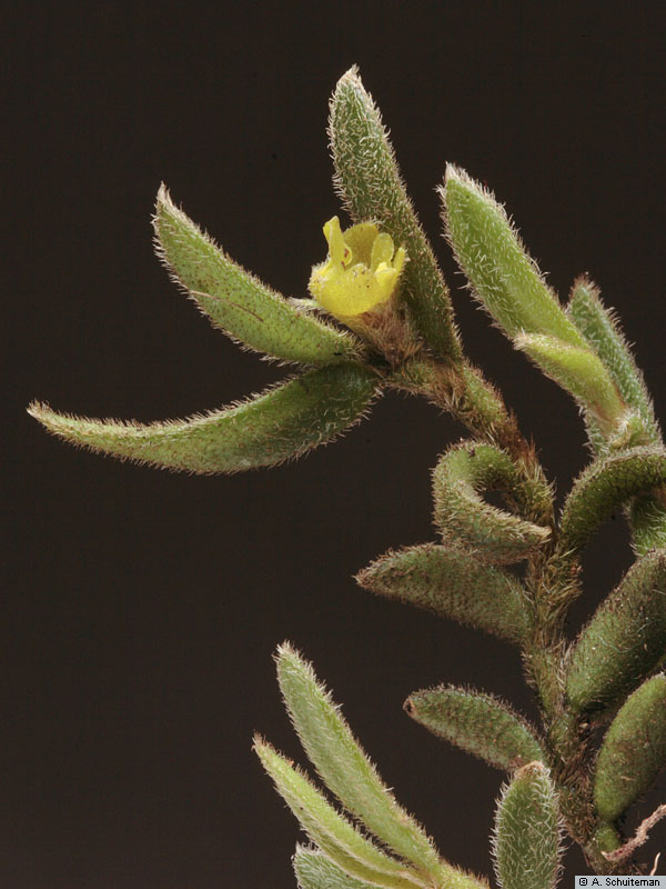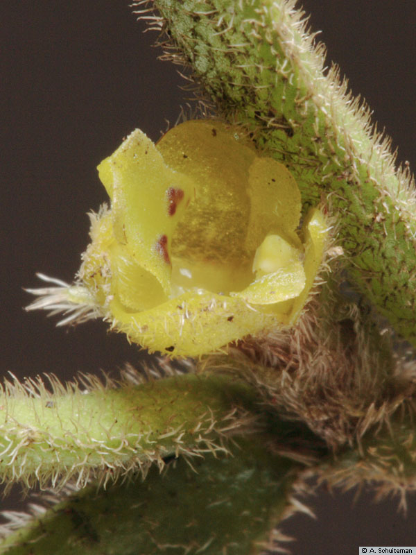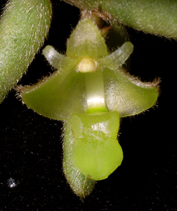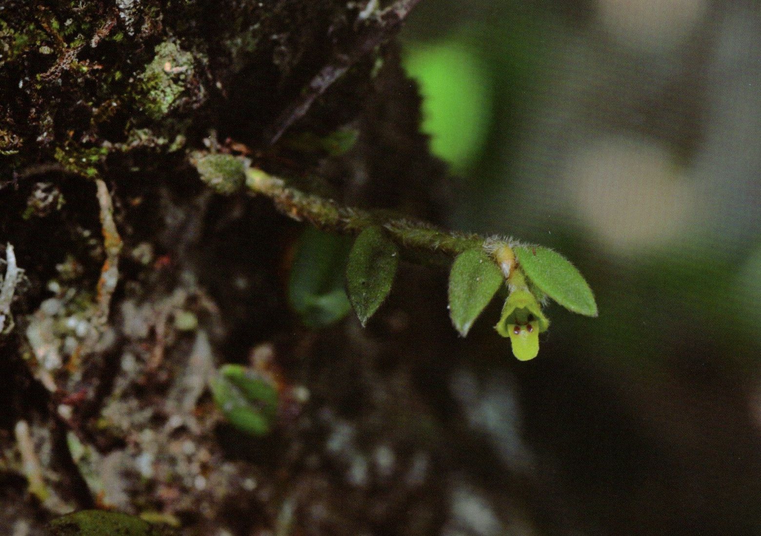 Found in Hainan province of China, Thailand, Malaysia, Laos, Vietnam, Borneo, Java and Sumatra in swamp, oak/laurel and lower montane forests at elevations of 600 to 2000 meters as a small to medium sized, pendant, warm to cool growing epiphyte or lithophyte with a long, creeping, branching rhizome giving rise to 2 rows of oblong, obtuse, fleshy, pubescent leaves with about 2.4" [6 cm] between each one and blooms in the winter on a densely hairy, .2" [4 mm] long, single flowered inflorescence with a hairy, linear floral bracts and hairy flowers.
