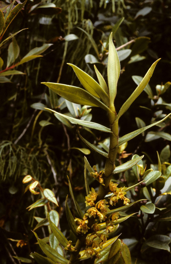 Found in Kalimantan Borneo in hill forests at elevations of 900 to 1700 meters as a medium to large sized, warm to cool growing epiphyte with an erect, hairy stem carrying linear-lanceolate, hairy, acute, basally clasping leaves that blooms in the spring on a lateral, ascending to descending, short, well spaced, few flowered inflorescence