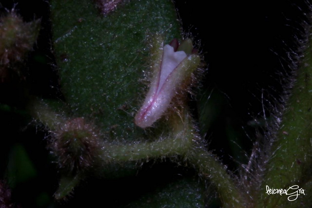 Found in Sumatra in lowland forests as a small sized, hot to warm growing epiphyte with clustered, pendulous, thin, pale green, long hairy stems carrying small, lanceolate, hairy on both sides leaves that blooms in the winter on a thin, short, rachis, thin, zig-zag, 5 to 8 flowered inflorescence with clasping, broadly ovate-triangular floral bracts.