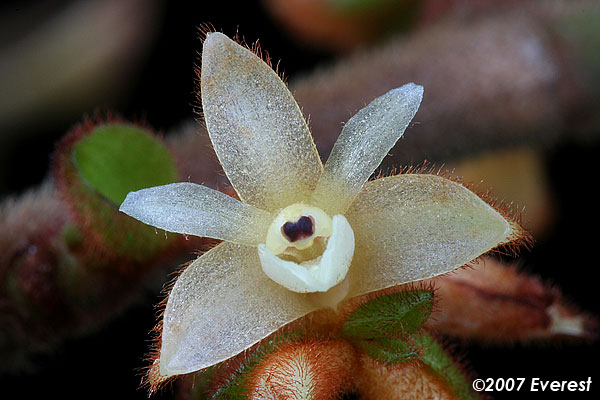 Found in Myanmar, Thailand, Malaysia, Sumatra, Java, Papua and New Guinea and Borneo low on tree trunks in open forest with seasonally high rainfall and a long dry season or in humid, mossy, mixed and coniferous forests on mossy branches of old gnarled trees at sealevel to 1100 meters or in primary montane forests to elevations of 1450 meters as a medium to large sized, hot to warm growing epiphytic plant with cane-like, softly villous stems forming dense untidy mats carrying coriaceous, oblong-lanceolate, downy beneath leaves and blooms in the summer and fall in nature, on a terminal or laterally from an internode, pendant, pubescent, short to 3" [to 7.5 cm], racemose, to several [6] flowered inflorescence that has 2 hairy floral bracts and a hairy, short-lived flower that does not open well.