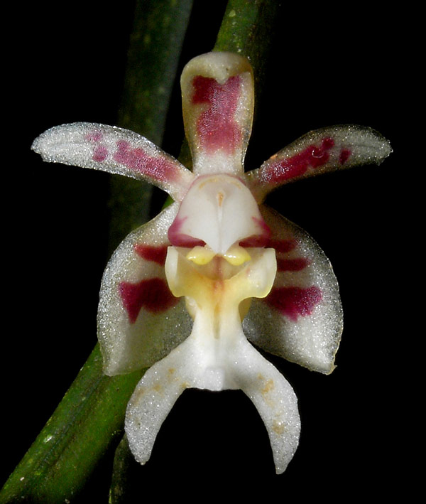 Found in penninsular Malaysia, Borneo, Java and Sumatra in lowland and hill forests at elevations up 200 to 1100 meters as a medium sized, hot to warm growing epiphyte with a pendant stem carrying linear-lanceolate, acute, unequally bilobed apically, basally clasping leaves that blooms mostly in the winter on 1 to 3, short, single flowered inflorescence carrying slightly fragrant flowers