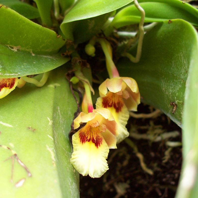 Found in Peru in forests at elevations around 400 to 800 meters as a small sized, hot to warm growing epiphyte with very small pseduobulbs enveloped completely by several, imbricating sheaths and carry a single, apical, leathery, acute, oblong to oblong-elliptic, narrowing below into the short, conduplicate base leaf that blooms in the spring on a basal, to 4" [to 10 cm] long, fractiflex, successively single, 2 to 5 flowered, racemose inflorescence that arises from the axil of the sheath.