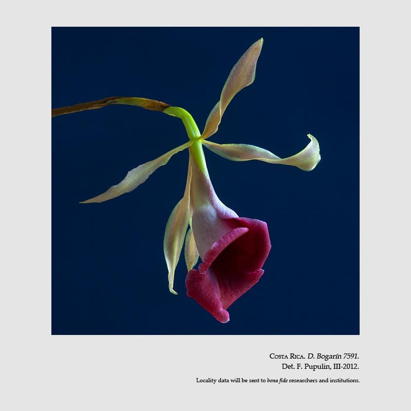 Found in San Jose Province of Costa Rica at elevations around 1000 meters as a small to medium sized, warm to cool growing epiphyte with elongate linear, ancipitous, tapering slightly pseudobulbs carrying a single, apical, erect, narrowly elliptic, acute to acuminate, narrowing below into the conduplicate, petiolarte base leaf that blooms in the late winter and early spring on a lateral, pendent to subpendent, to 1.2" [3 cm] long, almost always single flowered inflorescence with an adpressed to the pedicel floral bract