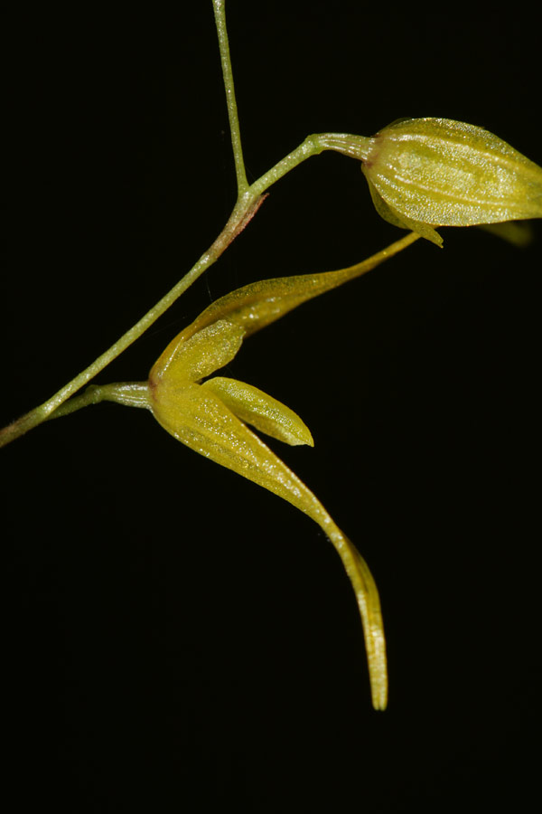 "Similar to T dirhamphis but differs in the narrowly elliptical leaves that are far exceeded by the lax, flexible, arching, successively flowered raceme [simultaneous in T dirhamphis] and long acuminate ssepals with the laterals connate to av=bout the middle into an ovate blade [the lateral sepals of T dirhamphis are free and spreading]. The petals are obtuse with the apical margin more or less irregular. The lip is distinctive by an erect pair of uncinate, basal lobes." Luer 1997