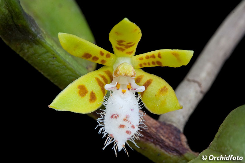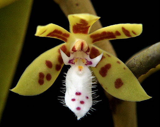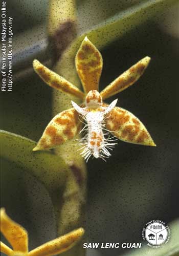 Found in southern penninsular Malaysia, Thailand and Myanmar as well as Java and Sumatra in lowland to montane mixed forests on large lower branches or forks of large treesat elevations of sealevel to 1000 meters as a large to giant sized, hot to warm growing, climbing epiphyte or occasional lithophyte on leaflitter and sandstone ledges on cliffs with slender branched stems carrying rather distant narrow, oblong to strap-shaped, deeply bilobed with unequal and obtuse lobes apically, sessile, leaves and blooms in the winter on fasciles oppisite the leaves, 1 to 3 at a node, single flowered inflorescence arising from the upper leaf axils and held close to the stem with wide open, fleshy, lemon scented flowers