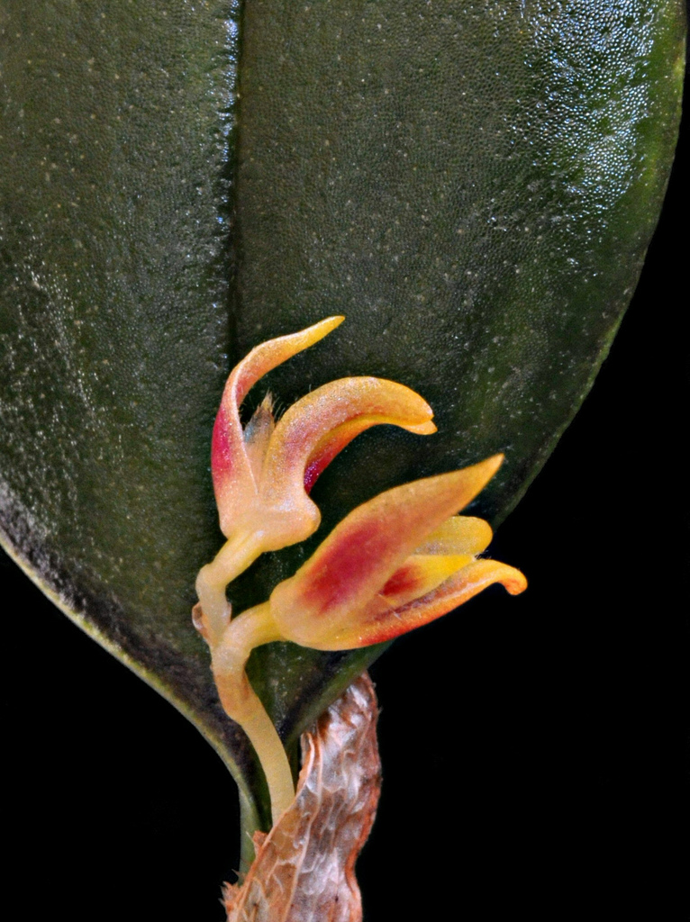 Found in Costa Rica and Panama at elevations around 400 to 1600 meters as a miniature sized, hot to cool growing epiphyte with comparatively stout, erect ramicauls enveloped by 5 to 10, ciliate lepanthiform sheaths and carrying a suberect to spreading to horizontal, coriaceous, dark green above, purple beneath, broadly elliptical to suborbucular, obtuse to rounded, abruptly contracted below into the petiolate base leaf that blooms in the winter and again in the summer on a filiform, congested, to .4" [to 10 mm] long, simultaneously 2 to 3 flowered inflorescence arising from behind the leaf, from near the apex of the ramicaul.