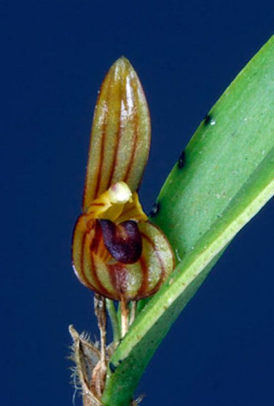 Found in Costa Rica in very wet premontane forests at elevations around 650 meters as a mini-miniature sized, warm growing epiphyte with slender ramicauls enveloped by 3 to 6, tubularadpressed, ribbed, minutely ciliate along the ribs and dilated ostia, brown leapanthiform sheaths and carrying a single, apical, erect, semi-coriaceous, ovate, acute, apiculate, cuneate and attenuate below into the petiolae base leaf that blooms in the late winter and spring on an erect, produced at the baseofthe leaf, peduncle .04" [1 mm] long, .32" [8 mm] long overall, successively 1 to 2 flowered inflorescence with clylindric, conduplicate, much shorter than the pedicel floral bract.
