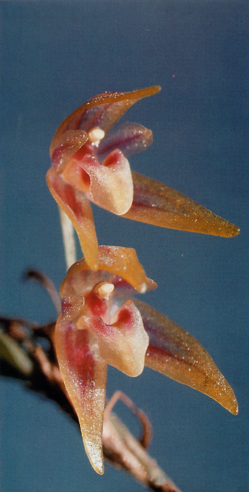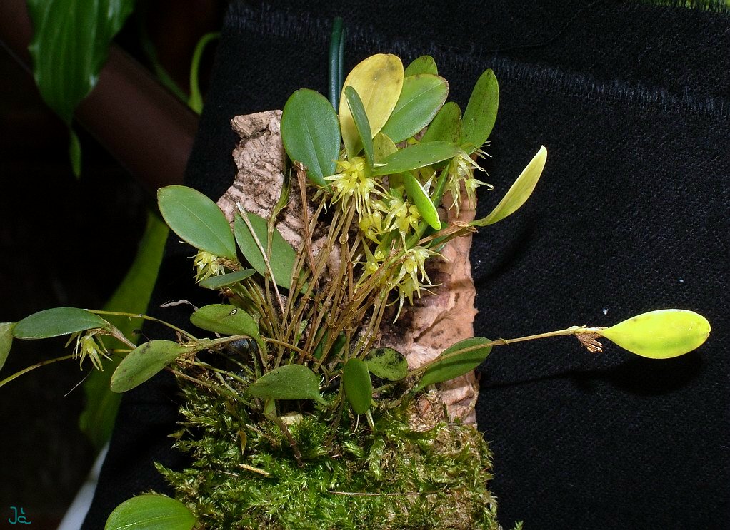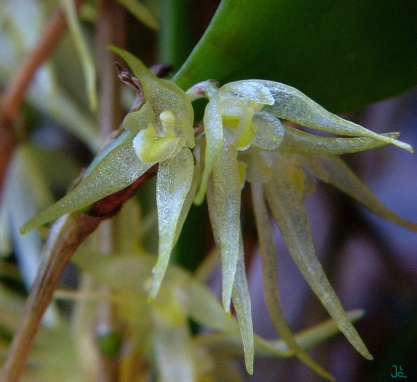 Found from the central cordillera of Colombia to southwestern Ecuador at elevations of 460 to 2100 meters as a miniature sized, warm to cool growing epiphyte with erect, slender ramicauls enveloped basally by 3 to 7 minutely scabrous, lepanthiform sheaths and carrying a single apical, erect, coriaceous, elliptical, obtuse leaf that is cuneate below into the petiole that blooms in the spring and fall on a fascile of loose, simultaneously 1 to 3 flowered, .4" [1 cm] long, racemose inflorescence arsing from near the apex of the ramicaul.