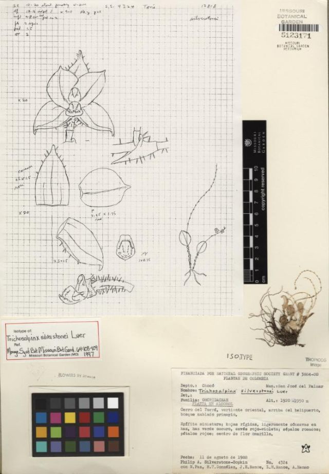 References W3 Tropicos, Kew Monocot list , IPNI ; Icones Pleurothallidinarum Vol XV Systematics of Trichosalpinx Luer 1997 drawing fide; Pleurothallids Neotropical Jewels Vol 1 Karremans & Viera 2020 as Pseudolepanthes silverstonei photo fide