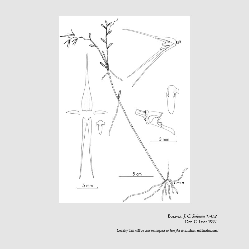 Found in La Paz department of Bolivia at elevations around 3000 meters as a miniature sized, prolific, cold growing epiphyte with stout, erect, prolific ramicauls enveloped by up to 10, ciliate lepanthiform sheaths and carrying a single, apical, erect, coriaceous, narrowly elliptical, subacute to obtuse, narrowly cuneate below into the petiolate base leaf that blooms in the summer on a loose, lightly flexuous, .8" to 1.6" [2 to 4 cm] long including the .4" [1 cm] long peduncle, simultaneously several flowered inflorescence arising from the apex of the ramicaul