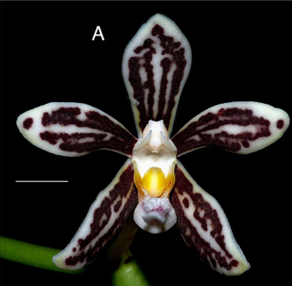Found in the Philippines on the island of Mindanao as a medium sized, hot to warm growing epiphyte with a stout, simple, entirely leafy stem carrying numerous, distichous, lorate, fleshy, abruptly rounded-retuse, unequally bilobed apically, basally clasping leaves that blooms in the late winter and early spring on an axillary, suberect, loosely paniculate below, short, few flowered branches, rachis to 9.2" [23 cm] long, several flowered overall with minute, triangular, clasping floral bracts and carrying small, subfleshy flowers streaked with dark brown on greenish yellow.