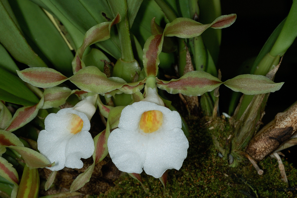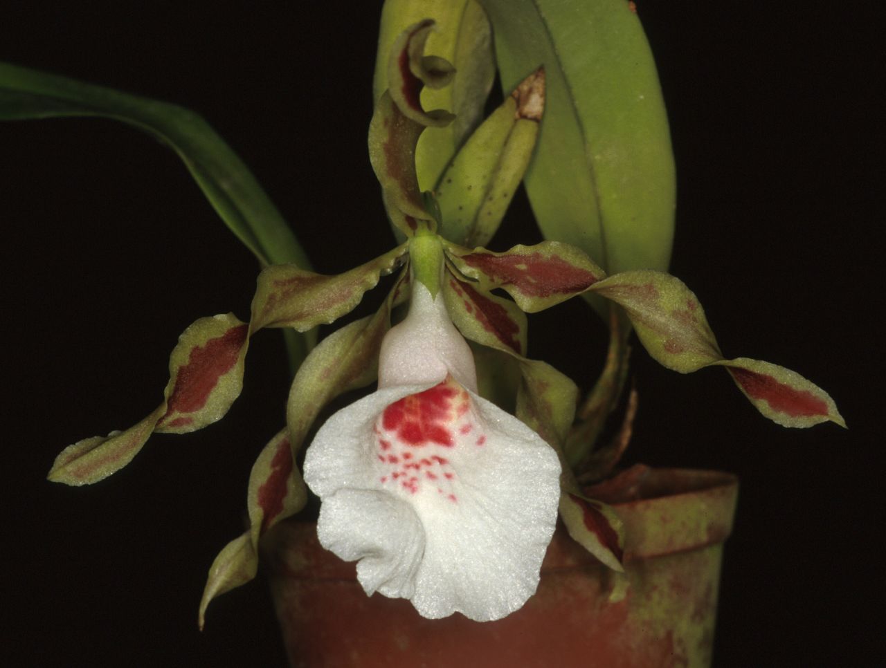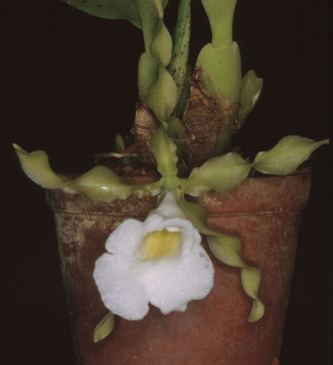 Found in Mexico, Guatemala, Beliza, El Salvador, Honduras, Nicaragua, Costa Rica and Panama in damp tropical forests at elevations up to 1500 meters as a medium sized, hot to warm growing epiphytic species with oblong to cylindric, laterally compressed pseudobulbs concealed by one or more brown spotted basal bracts carrying a single, subcoriaceous, elliptic-lanceolate, abaxially carinate leaf with a conduplicate petiole at the base that flowers on a basal, pendulous, 2 to 4" [5 to 10 cm] long, slender, 1 to 3 flowered inflorescence, arising on a newly matured pseudobulb, that has tubular, scarious bracts and large, showy, fragrant, waxy flowers.