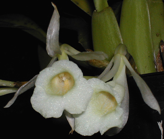 Found in Nicaragua, Costa Rica, Panama and western Colombia in lowland and premontane rainforests at elevations of 500 to 1200 meters as a miniature sized, hot to cool growing epiphyte with ovoid-lanceolate, laterally compressed pseudobulbs enveloped basally by a few imbricating, scarious sheaths and carrying a single, apical, coriaceous, elliptic, acute, gradually narrowing below into the conduplicate, short petiolate base leaf with a prominent keel abaxially and blooming on a short, lateral, 2 to 5 successively single flowered, racemose inflorescence arising on a mature pseudobulb with a triangular floral bract and short lived, fragrant flowers that do not open fully occuring in the fall and winter.