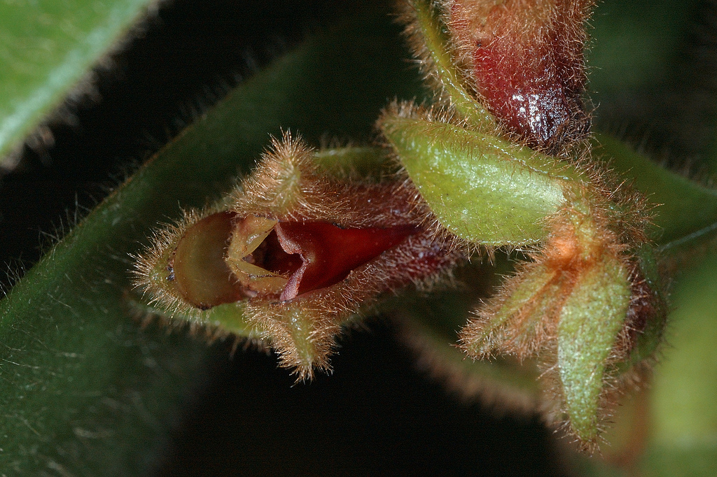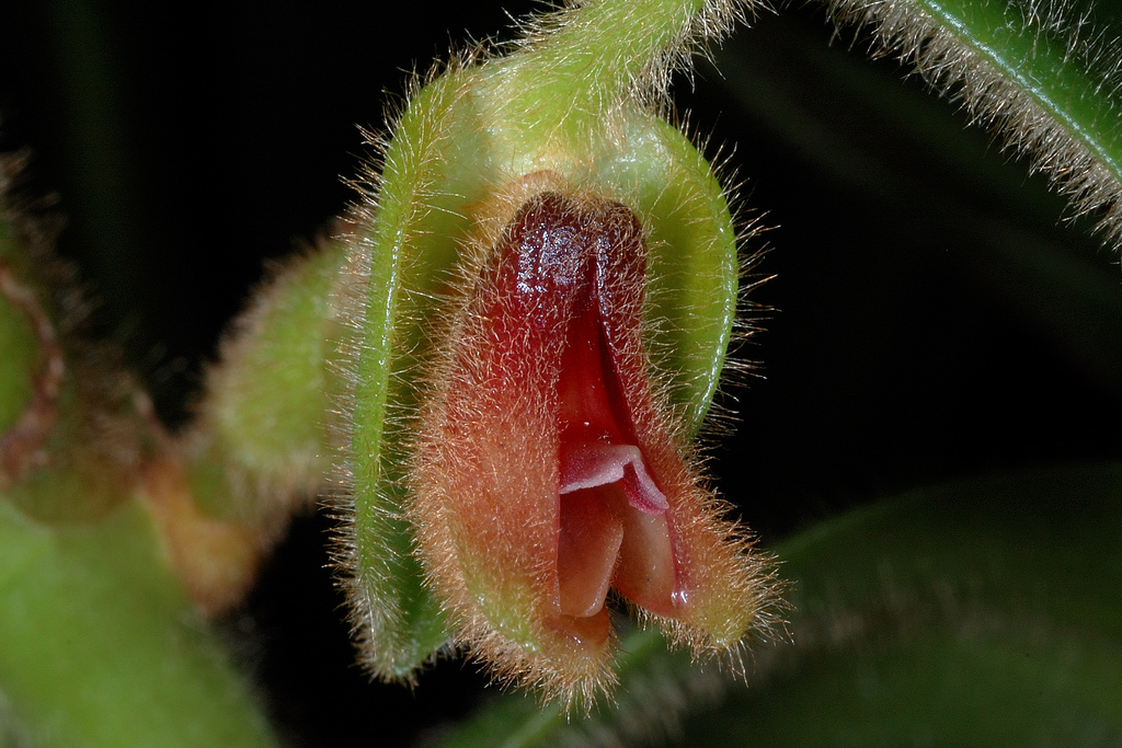 Found in the Philippines occurs at elevations of 50 to 1600 meters as a small sized, hot to cool growing, epiphytic plant from and has cane like stems with 2 ranked, oblong-lanceolate, acute, red pubescent below, silky above leaves and blooms in the spring on a hairy, 4" to 8" [10 to 20 cm] long, zigzag inflorescence with hairy bracts and flowers.
