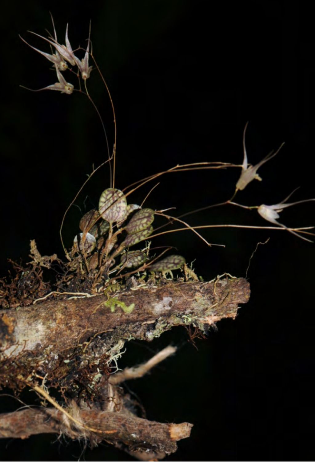 Found in Cusco department of Peru at elevations around 2200 meters as a mini-miniature sized, cold growing epiphyte with erect to suberect, slender ramicauls enveloped by 2 to 3, tight, ribbed, microscopically scabrous lepanthiform sheaths with dilated, acuminate ostia and carrying a single, apical, erect, coriaceous, gray-green with purple reticulation, broadly elliptic to suborbicular, rounded and minutely retuse with a small deflexed apiculum, broadly cuneate abruptly contracted below into the petiolate base leaf that blooms in the fall on a erect to suberect, from the apex of the ramicaul, peduncle 1.6 to 2" [4 to 5 cm] long, rachis .8" [2 cm] long, loose, simultaneously 2 to 4 flowered inflorescence with microscopically verrucose, acuminate, slightly shorter than the ovary floral bracts carrying light tan colored flowers with red marked veins.
