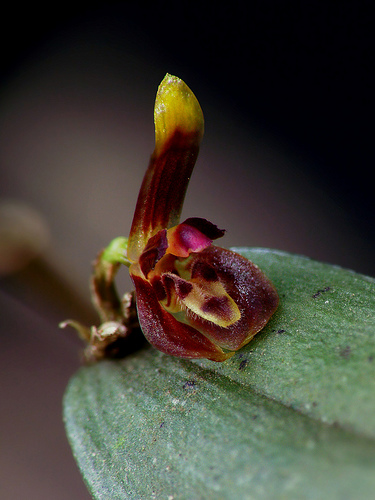 Found in Guatemala?, Costa Rica and western Panama in cloud forests at elevations around 1400 to 1800 meters as a mini-miniature sized, cool growing epiphyte with slender, erct, ramicauls enveloped by 8 to 10, coarsely long-ciliate, lepanthiform sheaths and carrying a single, apical, erect, coriaceous, ovate, acute to subacute, contracted below into the petiolate base leaf that blooms in the fall through spring on a racemose, .2 to .25" [5 to 7 mm] long, fascile of successive, single flowered inflorescence arising from near the apex of the ramicaul and carrying the flower on the front of the leaf.