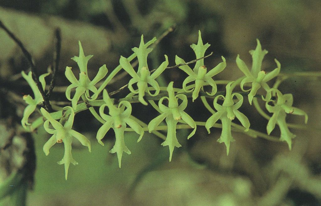 Found in Tanzania, Malawi and Zambia in stunted high elevation Brachystegia forests and on scattered trees in grasslands at elevations of 1360 to 2100 meters as a small sized, cool to cold growing epiphyte with an erect, short stem enveloped completely by imbricate, leaf sheaths carrying 2 to 4, stiff, tightl;y conduplicate, linear, obtuse leaves that blooms in the later spring on 1 to 2, axillary, below the leaves, to 4" [10 cm] long, to 10 flowered inflorescnece