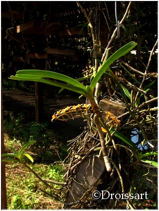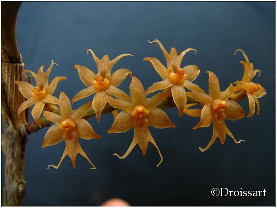 Found in Cameroon, Gabon and Zaire on granite rocks at elevations of 750 to 1070 meters as a small to giant sized, warm growing lithophyte with upright to semi-pendent stems carrying 3 to 9, linear, leathery, thick, bright green leaves that blooms in the fall or winter on a 1.2" to 2" [3 to 5 cm] long, 6 to 12 flowered inflorescence