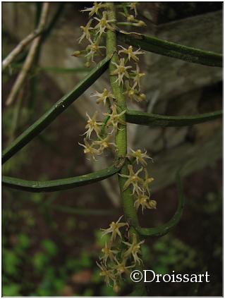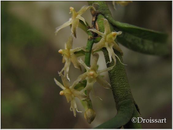 Found in central Zaire as a medium sized epiphyte with long, branching stems with a small stipule below each leaf and carrying linear-lanceolate, tapering at both ends, unequally bilobed apically leaves that blooms on a racemose, short to .6" [1.5 cm] long, 5 to 6 flowered inflorescence