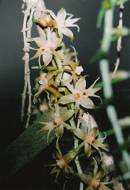 Found in Guinea, Ivory Coast, Burundi, Central African Republic, Cameroon, Gabon, Gulf of Guinea Islands, Rwanda, Zaire, Tanzania, Uganda, Angola, Malawi, Mozambique, Zambia and Zimbabwe in evergreen and or riverine forests at elevations of 900 to 1800 meters on trunks and lower branches of trees or lithophyte on rocks as a giant sized, warm growing epiphyte with an elongate, erect to trailing stem carrying distichous, in the apical third, linear to strap-shaped, unequally bilobed apically leaves that blooms in the late spring and early summer on several to many arising along the stem, 1 to 2" [2.5 to 5 cm] long, 10 to 16 flowered, racemose inflorescence.