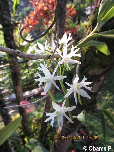 Found in Gabon as a small to large sized, hot to warm growing lithophyte with an erect to straggling, leafy towards the apex stem carrying strap-shaped, obtusely bilobed apically leaves that blooms in the summer on a mostly below the leaves, 4 to 4.8" [10 to 12 cm] long, 7 to 10 flowered inflorescence carrying strongly sweetly scented flowers
