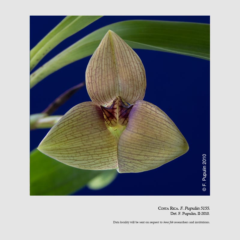 Found in Costa Rica, Panama and Ecuador in mossy forests at elevations of 800 to 1000 meters as a medium sized, warm to cool growing epiphyte from wet montane forests with repent or scandent. elongate, cylindric rhizome with internodes 6 to 16" [15 to 40 cm] long, giving rise to distant, ovoid, compressed, ridged, sulcate, tapering pseudobulbs carrying 3 to 5, subcoriaceous, obl;ong-lanceolate, acute, contracted below into the slender, conduplicate, petiolate base leaves that blooms in the winter and spring on an erect, basal, usually solitary, 3.2 to 6.4" [8 to 16 cm] long, single flowered inflorescence.