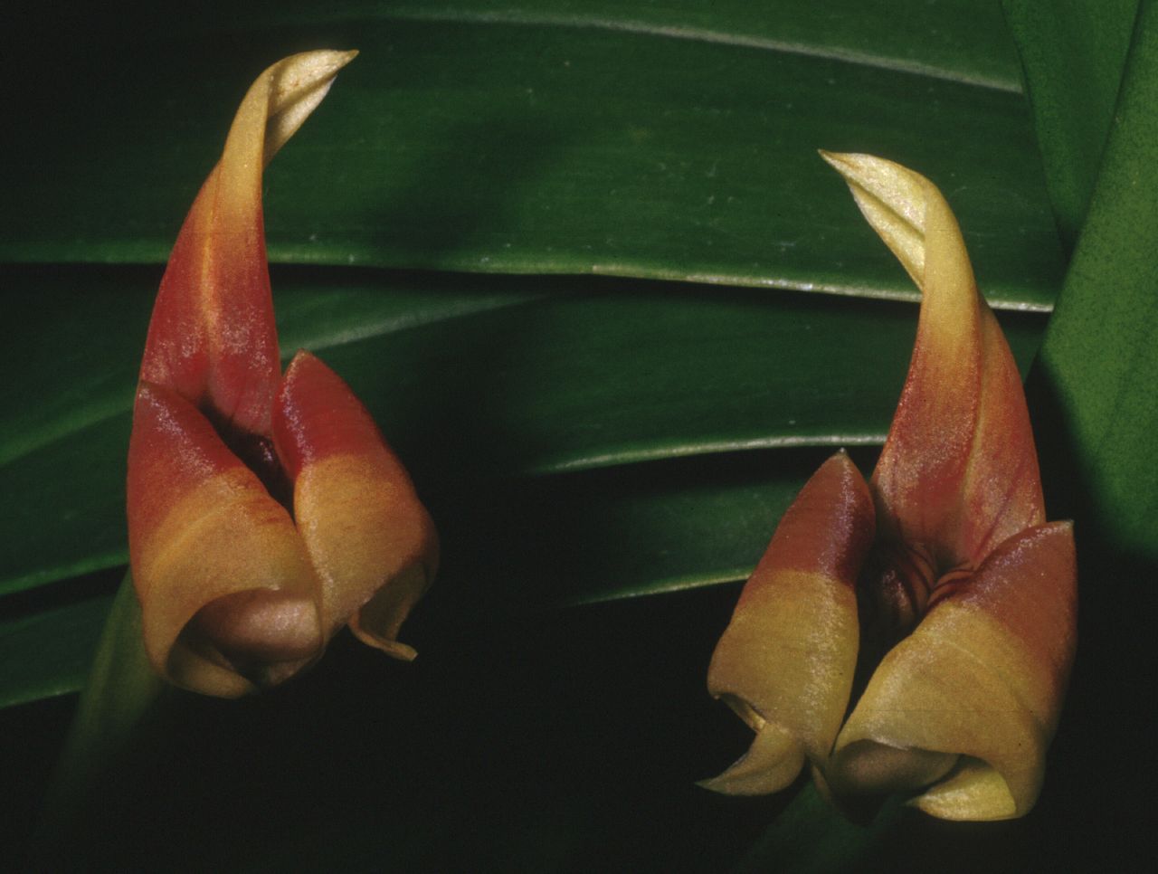 A medium sized, hot to warm growing species that is found in Ecuador, Colombia, Brazil, The Guianas, Bolivia and Venezuela in tropical wet forests in large trees at elevations of 220 to 1000 meters, with ovoid, compressed, 2", smooth pseudobulbs closely spaced on the rhizome, with 2 apical, conduplicate below into the short petiolate base leaves that are linear-lanceolate, pointed, coriaceous, and 8-20" long. It has numerous basal inflorescence that are stiff, erect, wiry, 5" [12 cm] long, single flowered, inflorescence arising on mature pseudobulb and holds the long lasting flower at mid-leaf and blooms in the fall, winter and spring.