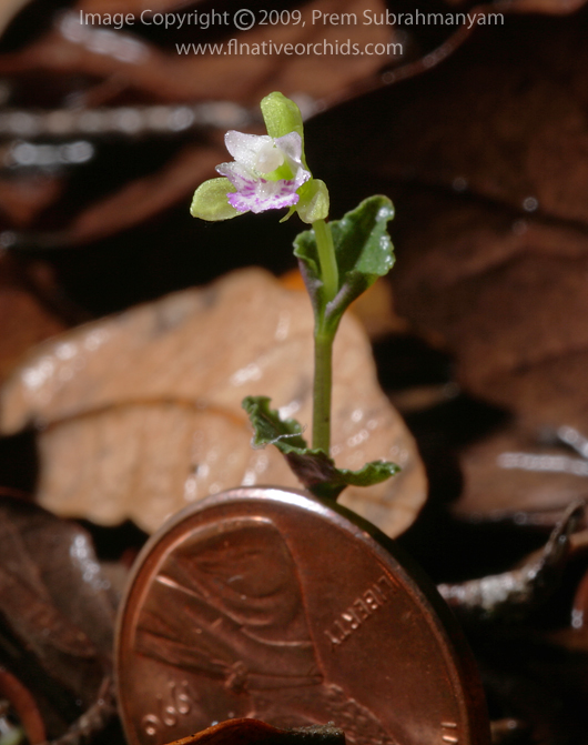 Found in WC Florida at low elevations as a mini-miniature sized, warm to cool growing terrestrial or occasional lithophyte with a subterranean corm giving rise to an erect, purplish, succulent stem carrying 1 to 4, dark green above, deep purple beneath, margins undulate, broadly ovate to cordate leaves that blooms in the spring on an erect, racemose, 1 to 3 flowered inflorescence
