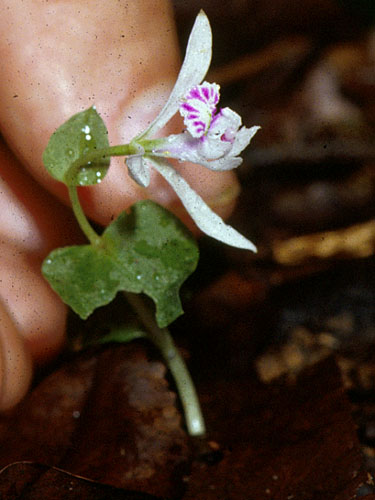Found in southern Mexico, Guatemala, Honduras, Costa Rica and Panama in wet and very wet forests at elevations of 400 to 1800 meters as a mini-miniature sized, hot to cool growing Mycoheterotrophic terrestrial with erect stems carrying a few, triangular-cordate, acute, shortly cuneate base leaves, that blooms in the late spring and summer on an axillary, terminal, 1 to few flowered inflorescence carrying white flowers with purple rays