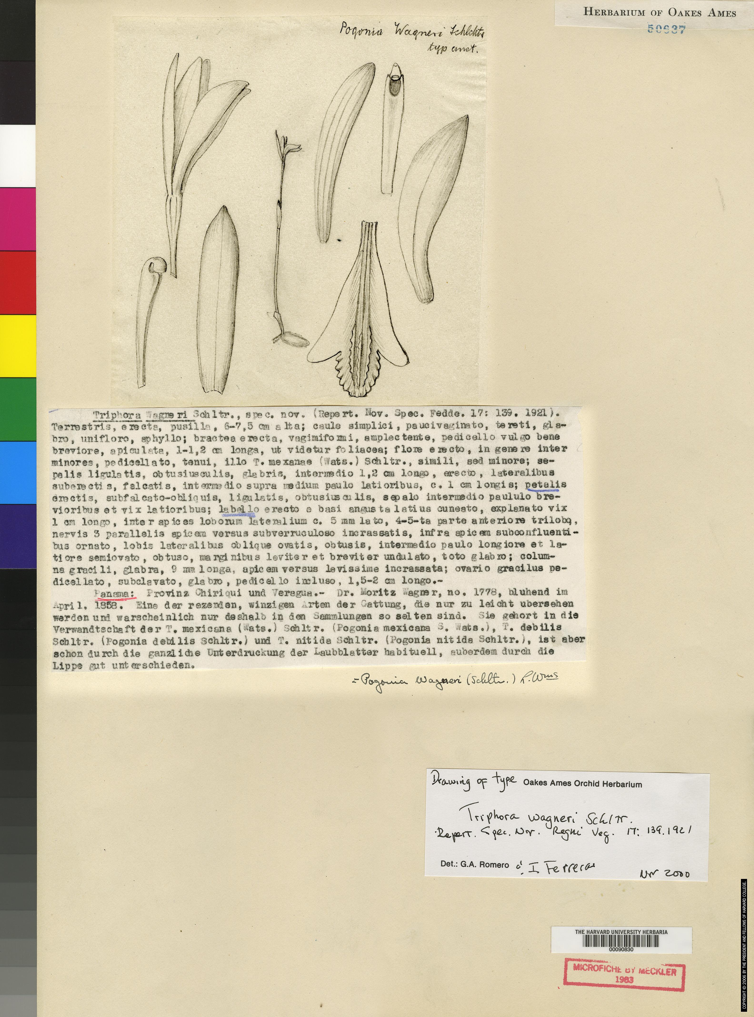References W3 Tropicos, Kew Monocot list , IPNI ; *Repert. Spec. Nov. Regni Veg. 17(481/485): 139. 1921; The Orchids of Panama L.O. Williams & P Allen 1946 as Pogonia wagneri