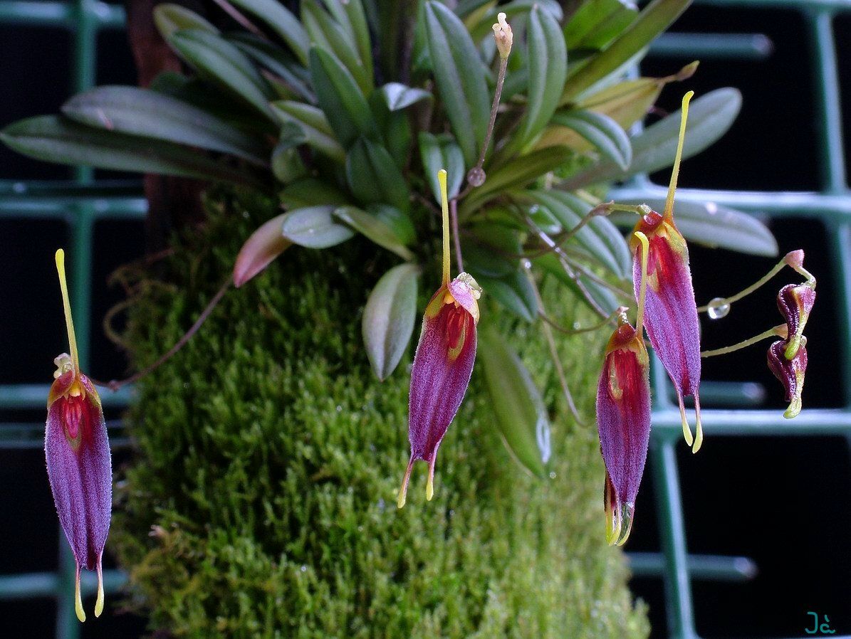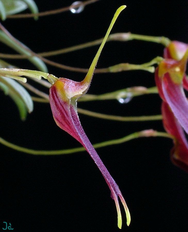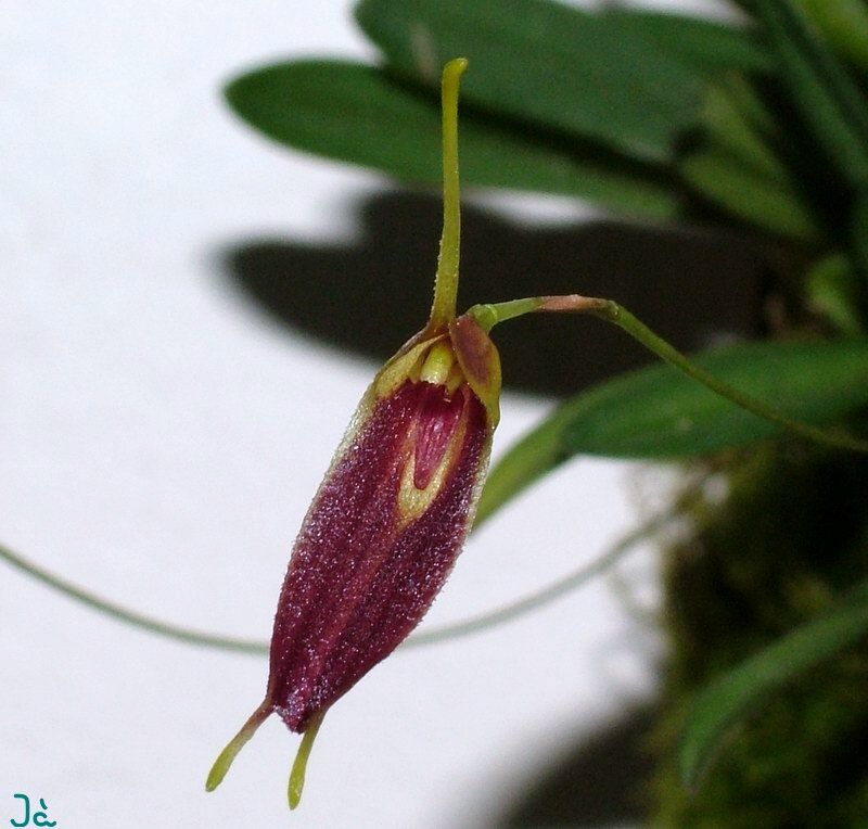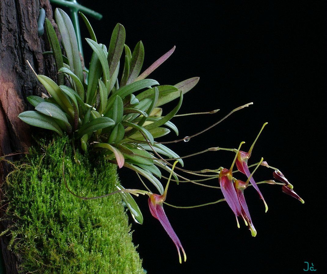 Found in southern Ecuador in tall rainforests along streams at an elevation of 1600 meters as a mini-miniature sized, caespitose, cool growing epiphyte with erect ramicauls enveloped by 2 to 3 loose tubular sheaths carrying a single apical, erect, coriaceous, narrowly elliptic, subacute leaf that has purple spotting on the underside and blooms on a slender, erect, 1.2 to 1.6" [3 to 4 cm] long, successively 2 to 5 flowered, racemose, smooth inflorescence arising from low on the ramicaul and holding the flower well above the leaf of single successive opening flowers.