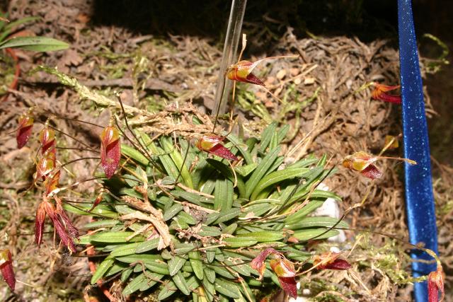 Found in central Peru at elevations around 1800 meters as a mini-miniature sized, densly caespitose, cool growing epiphyte with erect, slender ramicauls enveloped by 2 to 3 tubular sheaths carrying a single apical, erect, fleshy, semiterete acute leaf and blooms in the spring on an erect, 2" [5 cm] long, congested verrucose raceme that arises from low on the ramicaul that has a succession of a few single flowers that are all held well above the leaves.