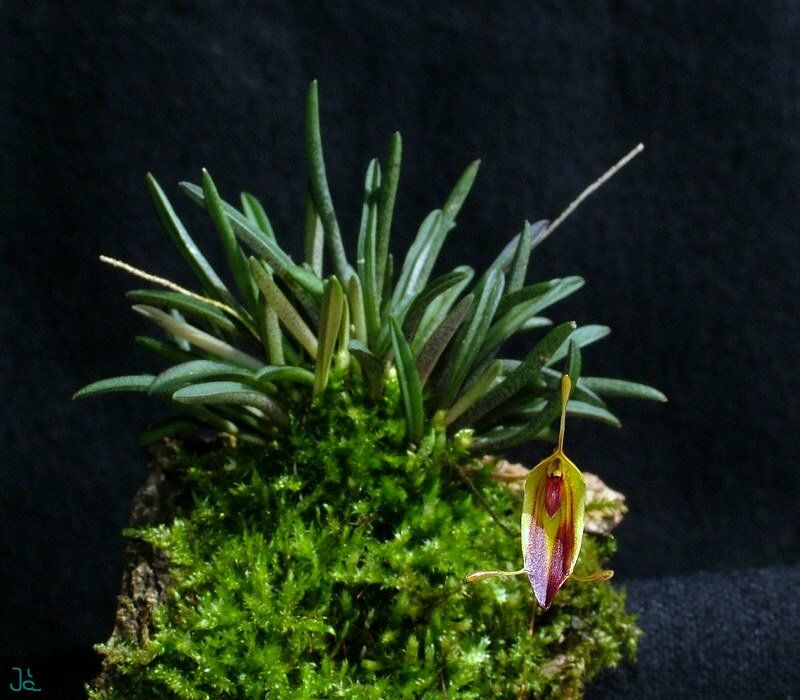 Found in Norte de Santander department of Colombia in wet cloud forests at elevations around 2100 meters as a mini-miniature sized, cold growing epiphyte with erect ramicauls enveloped by 2 to 3 loose, tubular sheaths and carrying a single, apical, erect, coriaceous, narrowly linear, subacute, gradually narrowing below into the petiolate base leaf that blooms in the spring on a slender, smooth, erect, [3 to 5 cm] long, congested, successively single, few flowered inflorescence arising from low on the ramicaul with a bract near the middle.