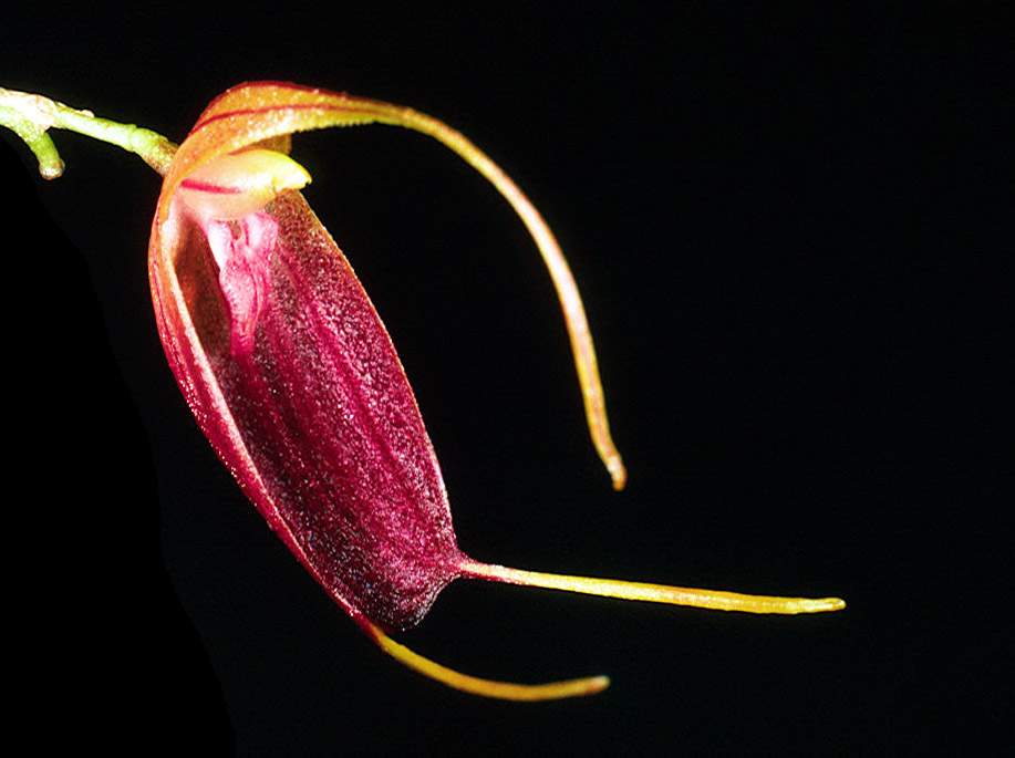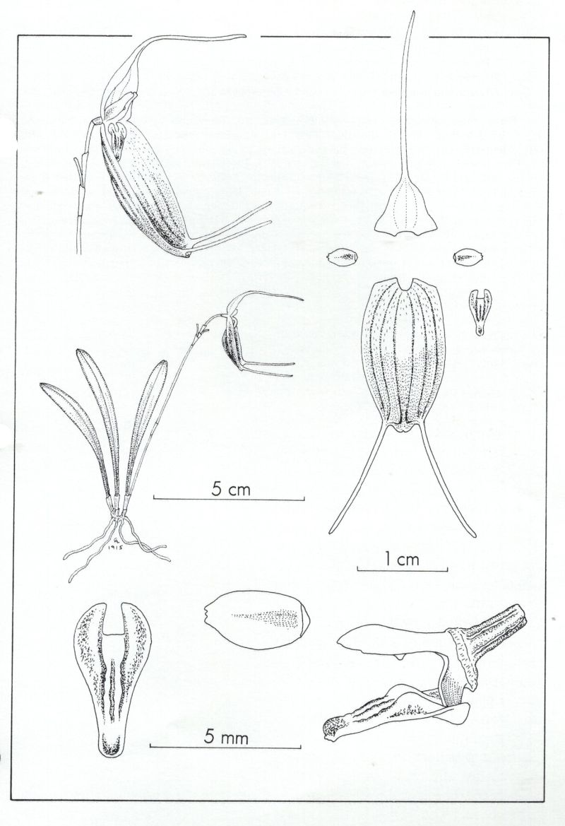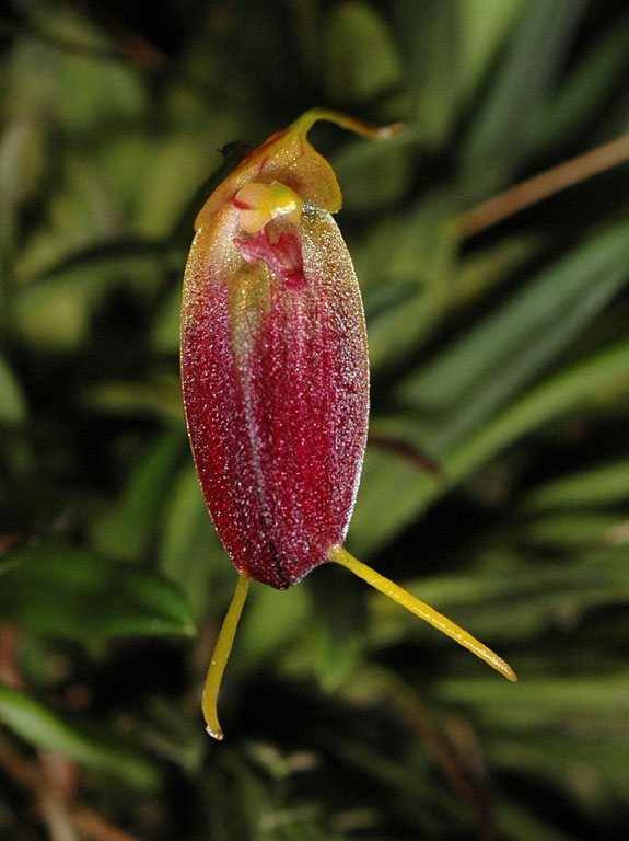 Found in the central cordillera of Colombia at elevations of 1700 to 1900 meters as a mini-miniature sized, cool growing epiphyte with slender roots, erect ramicauls enveloped basally by 2 to 3 thin tubular sheaths and carrying a single, apical, erect, coriaceous, narrolwy elliptical, acute to subacute leaf that is faintly motttled beneath with purple that blooms in the fall on a slender, erect, 1.6" to 5.4" [4 to 6 cm] long, successively single flowered, racemose inflorescence arising from low on the ramicaul, with a bract below the middle, a floral bract and 2 to 6 successive flowers. This species can be distinguished from others by it's cymbiform synsepal that is broadly concave towards the middle and covered within by tiny, red, glandular hairs that sparkle. The petals are elliptical, the lip is ovate and broadest towards the base and narrowest at the apex.