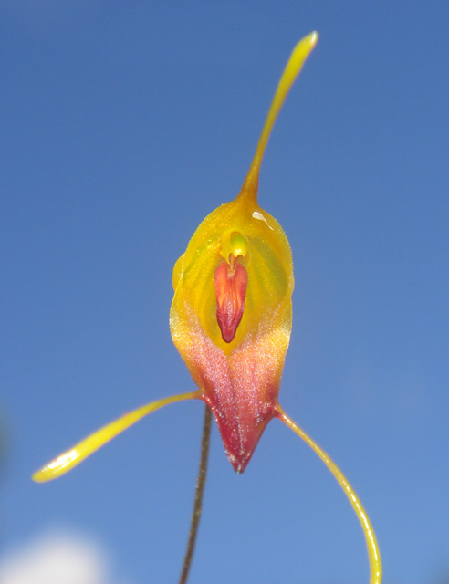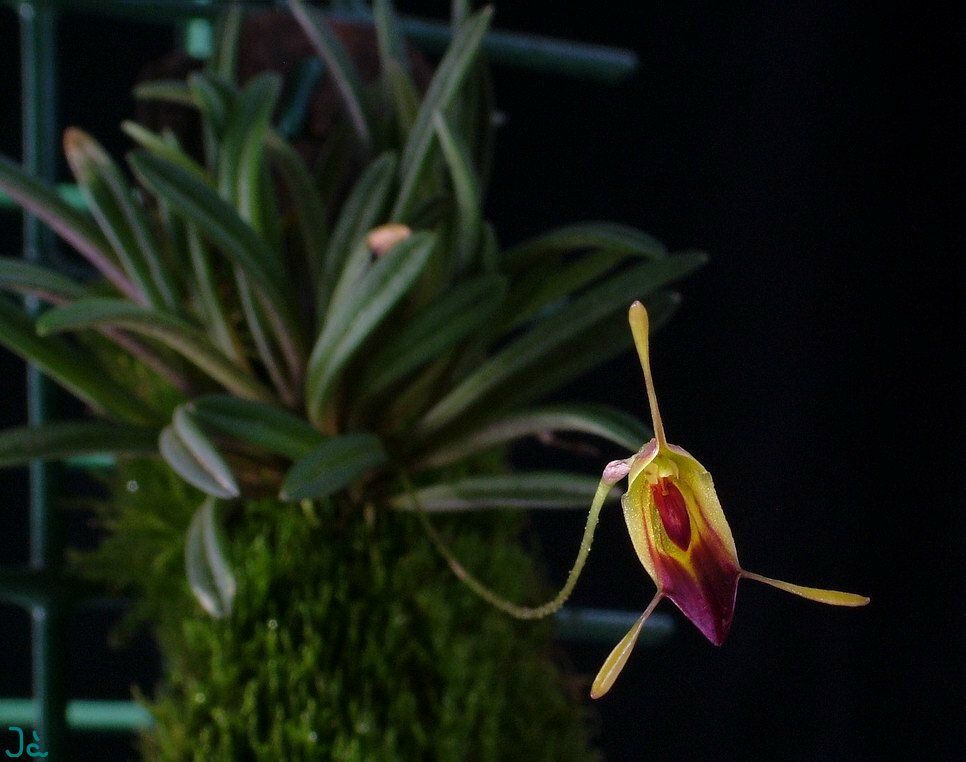 Found in the Cordillera del Condor of Ecuador at elevations of 1500 to 1650 meters as a mini-miniature sized, cool growing epiphyte with short, slender ramicauls envelopped by 2 to 3 thin, tubular sheaths and carrying a single, apical, erect, fleshy, linear, semi-terete, acute, gradually narrowing below into the base leaf that blooms in the fall on a erect, slender, congested, verrucose, 3 to 4" [7.5 to 10 cm] long, successively single, few flowered inflorescence arising from low on the ramicaul with a bract below the middle.