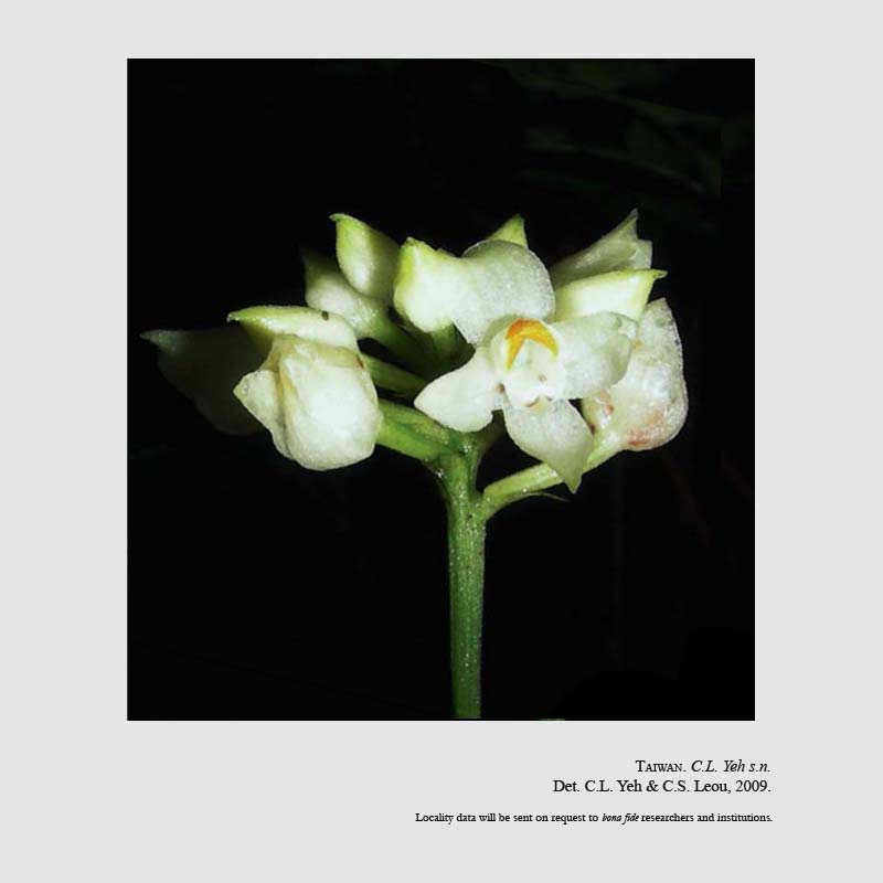 Found in southwestern Taiwan on montane slopes in cloud forests in shade at elevations of 600 to 800 meters as a small sized, warm growing terrestrial with an erect stem carrying mostly a single, apical, thin, linear-lanceolate, acuminate, acute basally leaf with three sheaths below that blooms in the summer on a terminal, erect, 2.4 to 2.6" [6 to 6.5 cm] long, densely 9 to 12 flowered inflorescence with lanceolate, glabrous, floral bracts and carrying non-resupinate flowers.