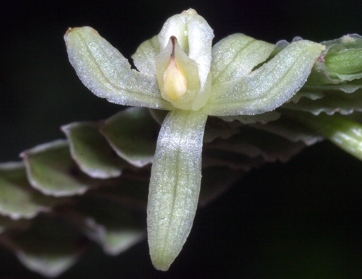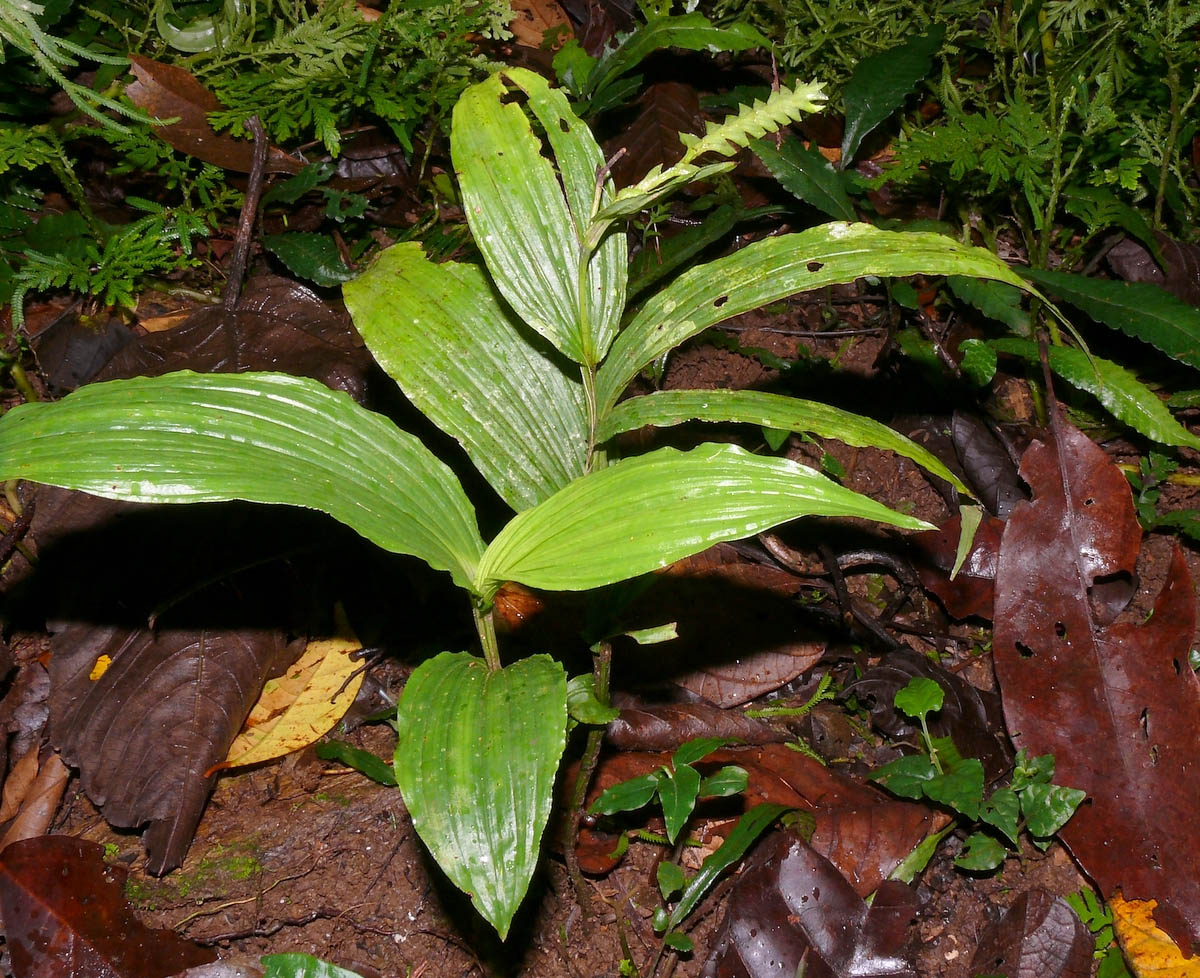 Found in the Moluccas and recently found in the Philippines in forests in deep shade at elevations around 600 to 1200 meters as a small sized, warm growing terrestrial with erect stems carrying 5 to 6, towards the apex, lanceolate, plicate, thin textured leaves that blooms in the later spring on a spreading, from near the apex, to 4" [10 cm] long, enveloped by alternating, imbricate, conduplicate, crisped margined bracts, successively single, many flowered inflorescence