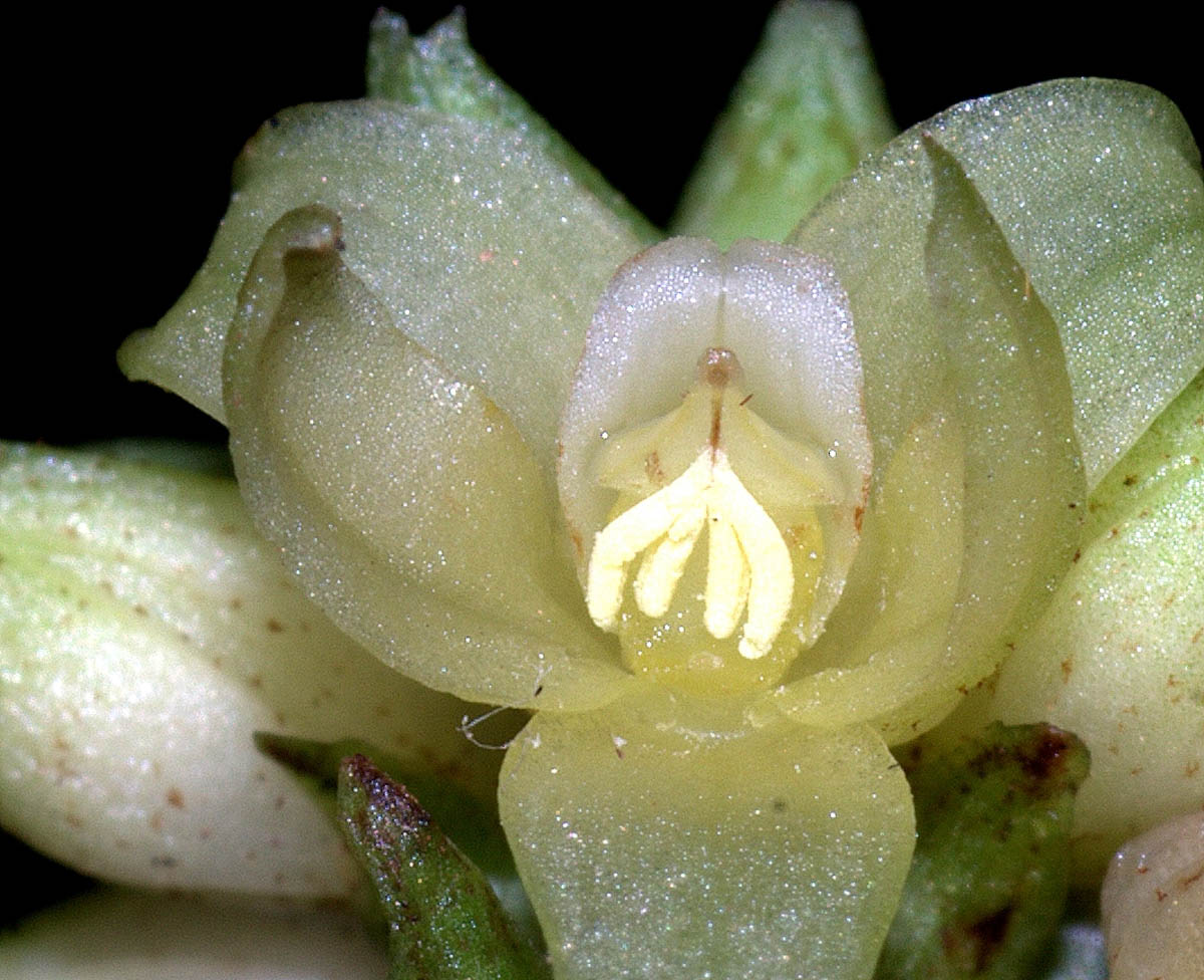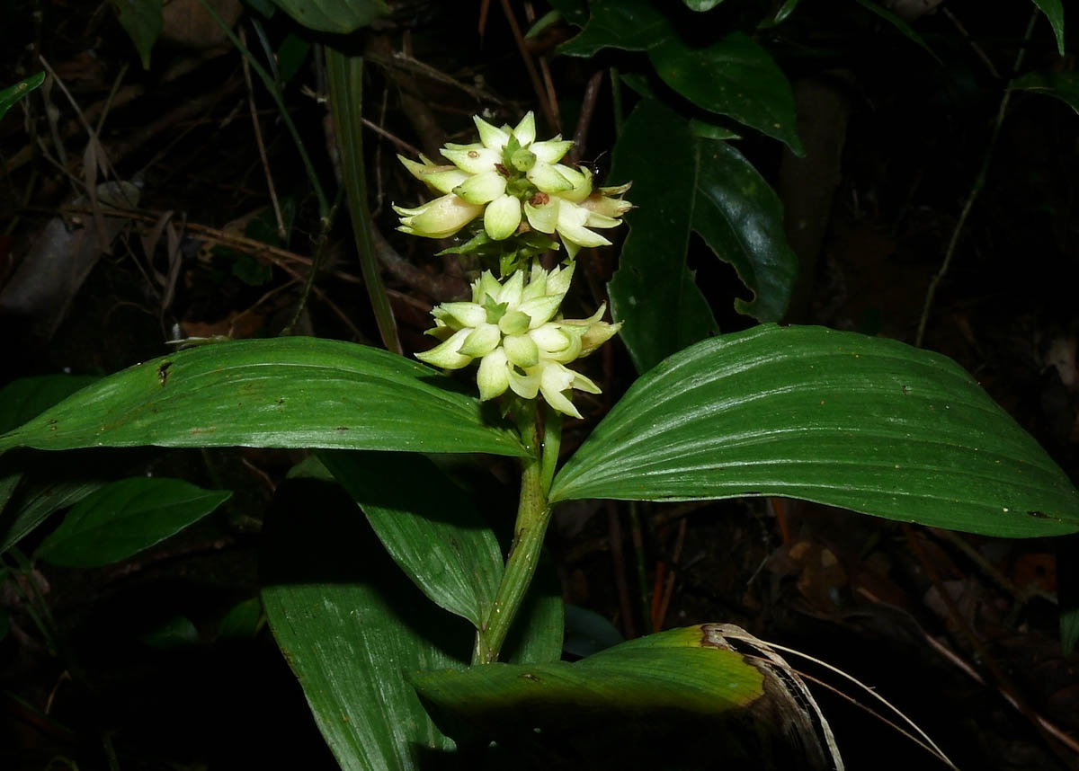 Found in the Philippines at elevations of 500 to 900 meters as a small sized, hot to warm growing terrestrial with an erect stem carrying in the upper half, lanceolate, plicate, 7 veined leaves that blooms in the late summer and earlier fall on an erect, short, branched, terminal, many flowered inflorescence carrying non-resupinate, fragrant flowers
