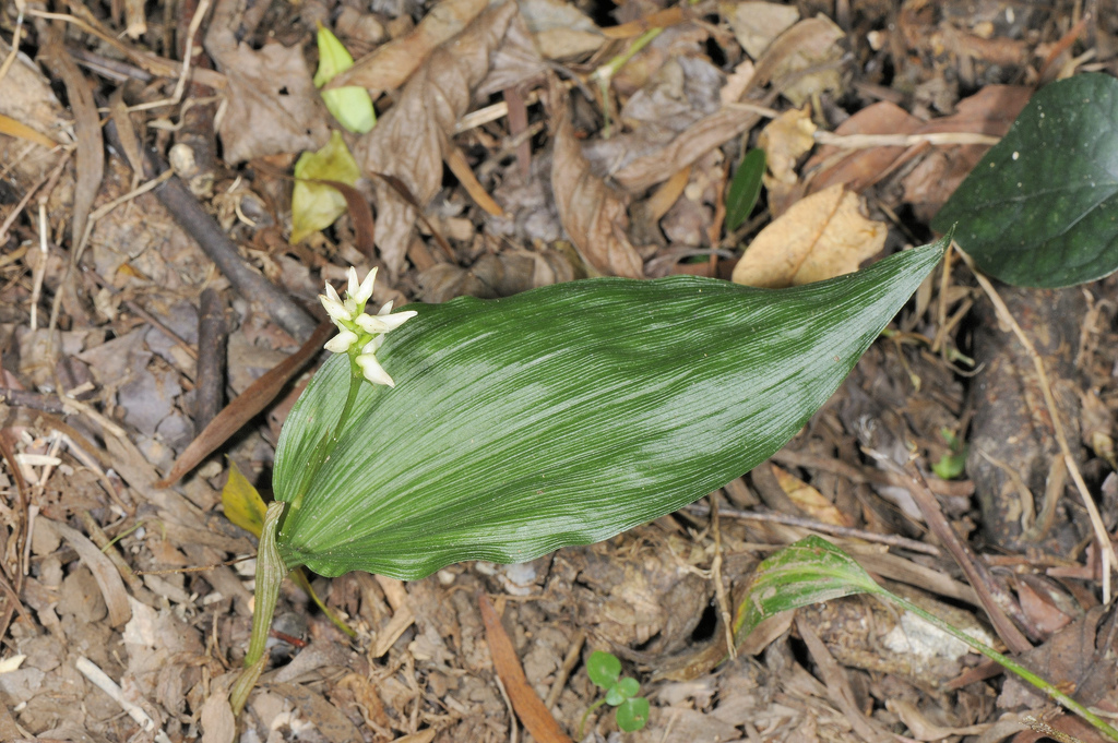Found in Taiwan and the southern Ryukyu Islands at low elevations as a small sized, hot growing terresrial with an ascending rhizome giving rise to an unbbranched to 1 to 2 branched stem provided with many sheaths carrying 1 to 2, apical, ovate to cordate, 7 to 13 veined, acute, rounded below into the base leaves that blooms in the late summer and early fall on an erect, terminal, 1.6 to 3.2" [4 to 78 cm] long, 10 to 20 flowered inflorescence with lanceolate, as long as to slightly longer than the ovary floral bracts and carrying non-resupinate flowers.