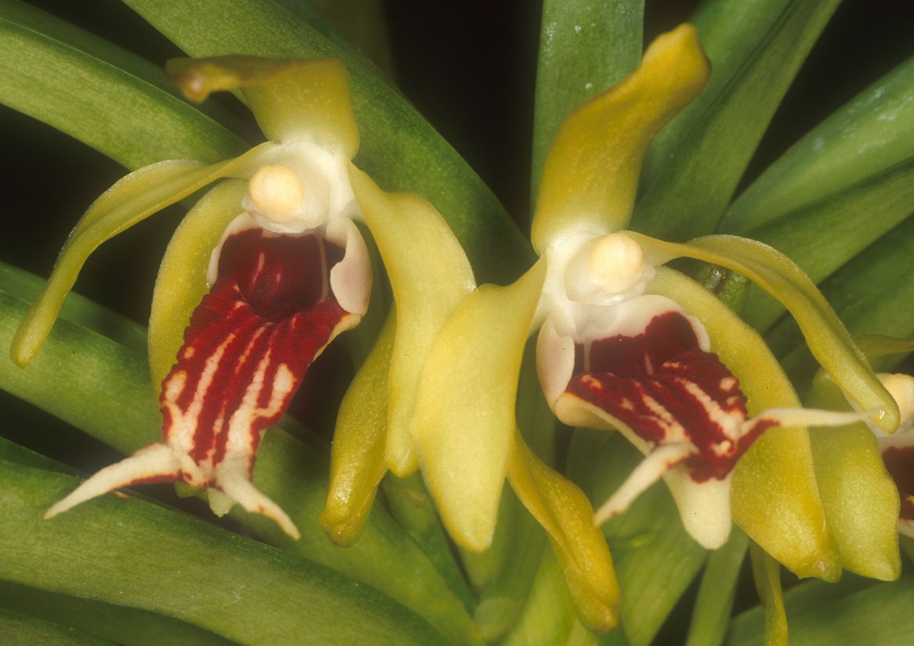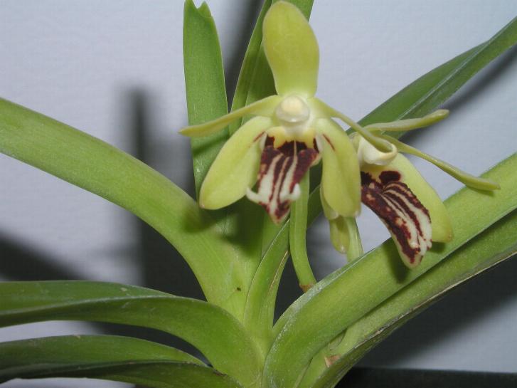 Found in Bangladesh, India, Nepal, Bhutan and Tibet province China in montane forests of on moss covered trees that can take some full sun at altitudes of 600 to 2300 meters as a medium sized, warm to cold growing monopodial epiphytic species with a stout stem carrying coriaceous, recurved, truncately tridentate apically, conduplicate, linear leaves that are articulated basally to the imbricate sheathing leaf bases and blooms in the spring and summer on an axillary, descending, short, few [2 to 6] flowered inflorescence with short, broad bracts that are shorter than the leaves.