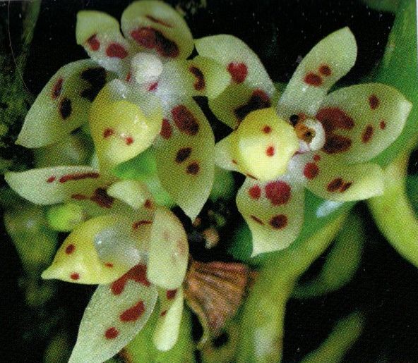 Found in Sulawesi in montane forests on branches of trees at elevations of 1200 to 1300 meters as a mini-miniature sized, cool growing epiphyte with a short stem carrying 4 to 5 tough, leathery, well spaced, grey green leaves that blooms in the late spring and summer on .4" [1 cm] long, club-shaped, successively 3 to 4, to 10 flowered inflorescence