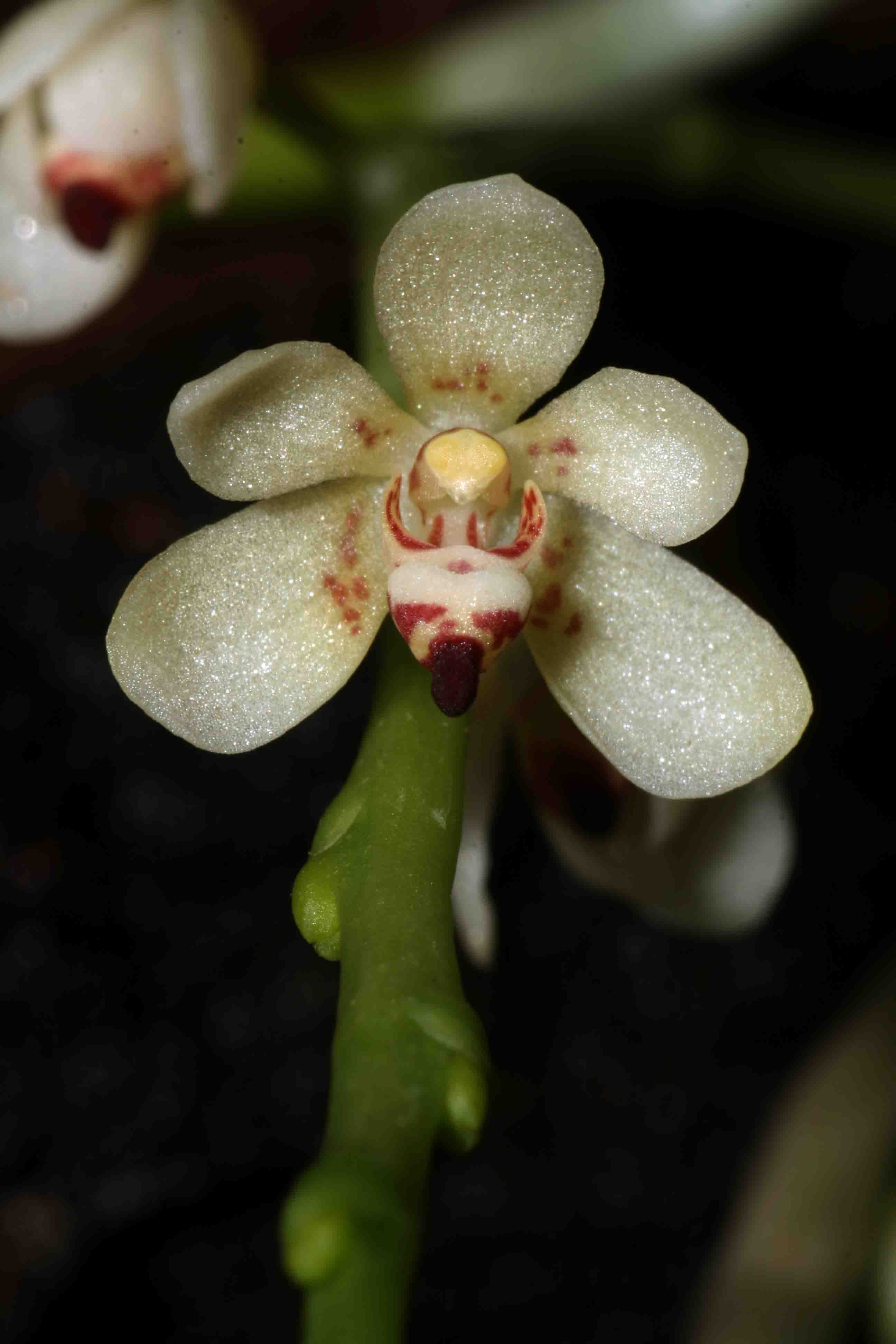 Found in south Yunnan and Hainan, Thailand and Vietnam on tree trunks in forest margins at elevations of 1000 to 1500 meters as a small sized, cool growing epiphyte with a stem carrying many oblong to falcate-oblong, acute leaves that blooms in the early summer on 2 to 8, opposite the leaves, yellowish green, longitudinally ribbed, 3.2" to 9.2" [8 to 23 cm] long, laxly many flowered inflorescence with broadly ovate floral bracts