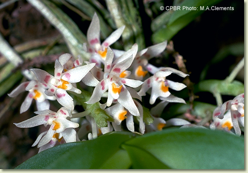 Found in northern Queensland Australia at elevations of 400 to 600 meters as a mini-miniature to miniature sized, hot to warm growing epiphyte with projecting to pendulous, sparsely branching stems carrying 3 to 8, crowded, thick, leathery, channeled, pale green to yellow green, unequaly bilobed apcailly leaves that blooms in the late summer and fall on an axillary, club-shaped, .4 to 1.4" [1 to 3.5 cm] long, 10 flowered inflorescence carrying short-lived flowers, .