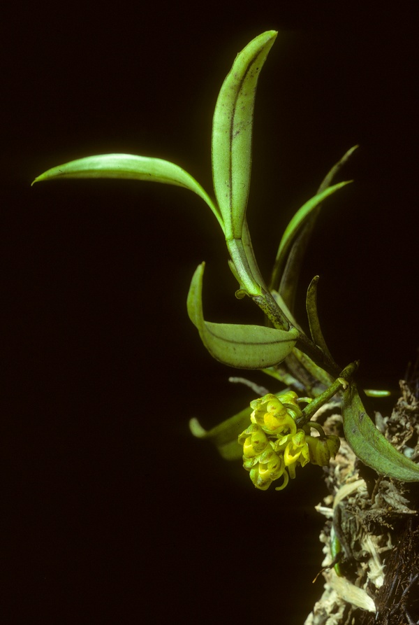 Found in the Chinese Himalayas, Assam, Bangladesh, eastern Himalayas, Bhutan and Nepal in dense forests on tree trunks at elevations of 1300 to 2300 meters as a miniature to small sized, cool to cold growing epiphyte with an arching terete, slender many noded stem carrying a few to several, distichous, narrowly lanceolate to oblique-oblong, acute to slightly praemorse leaves that blooms in the spring through early summer on an arching, 2.8 to 4" [7 to 10 cm] long, densely many flowered inflorescence with ovate floral bracts and slightly fleshy flowers that do not open well