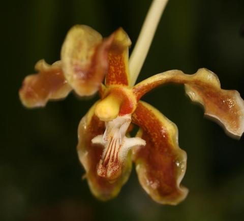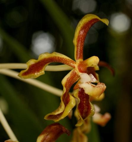 Found in the Moluccas as a small to medium sized, hot to warm growing epiphyte with a leafy stem carrying glabrous, waxy, sessile, distichous, linear, ligulate, recurved, unequally praemorse apically leaves that blooms in the late fall and early winter on an axillary, cylindrical, porrect, racemose, 4 to 6" [10 to 15 cm] long, 6 to 9 flowered inflorescence .