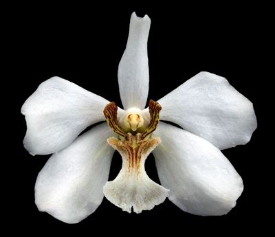 This orchid is related to both V javeriae and V roeblingiana but differs from both of these by the coriaceous [not stiff] leaves, the large curved side lobes of the lip that rise above and around the column, the color of the side lobes which is a white exterior with an deep red brown interior, the fimbriate mid-lobe apex, the non-fragrant flowers, the white, faintly spotted red sepal and petal color and the 2 ridges and 2 horns of the lip