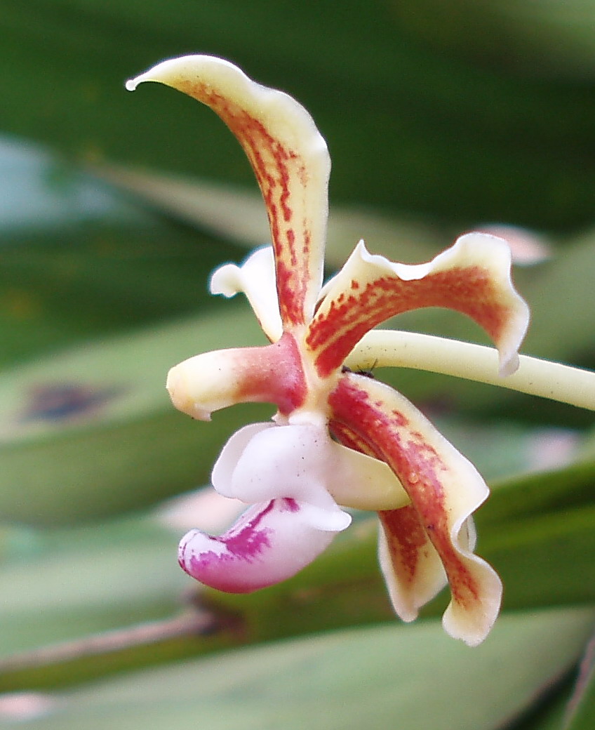 Found in Sulawesi at elevations of 500 to 600 meters where it has been recently rediscovered, Vanda celebica was thought to be extinct as the last known specimen was collected in 1910. It is a large sized, warm growing, clump forming monopodial epiphyte from north Sulawesi with rather thin decurved leaves and blooms in the summer on a short, to 8 flowered inflorescence.